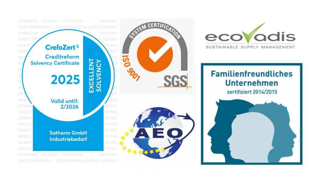 SATHERM: Supplier of spare parts for industrial maintenanceCertified qualityISO 9001:2015 certification: A commitmentWe attach a lot of importance to our quality policy in order to be in constant improvement and satisfy at best our clients. As a partner, the customer is at the center of all our business processes. Authorised Economic Operator (AEO)Satherm secures its supply chain and puts on a display its reliability to the Customs services with the AEO status it posseses. EcoVadisSatherm is solicitous to environmental and social risks. We use the CRS solution from EcoVadis. Satherm, a familily-friendly companyIn order to remain competitive in the context of globalization, the balance between work and family life is an important element. Satherm was rewarded as one of the first 75 Saar companies with the certificate “family business” from the IHK (COC) and the Ministry of Social Affairs, Welfare, Women and Family.